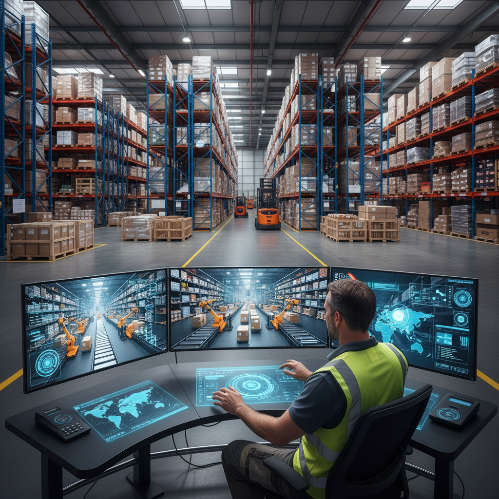 Operator nadzorujący pracę systemu zarządzania logistyką w nowoczesnym centrum dystrybucyjnym.