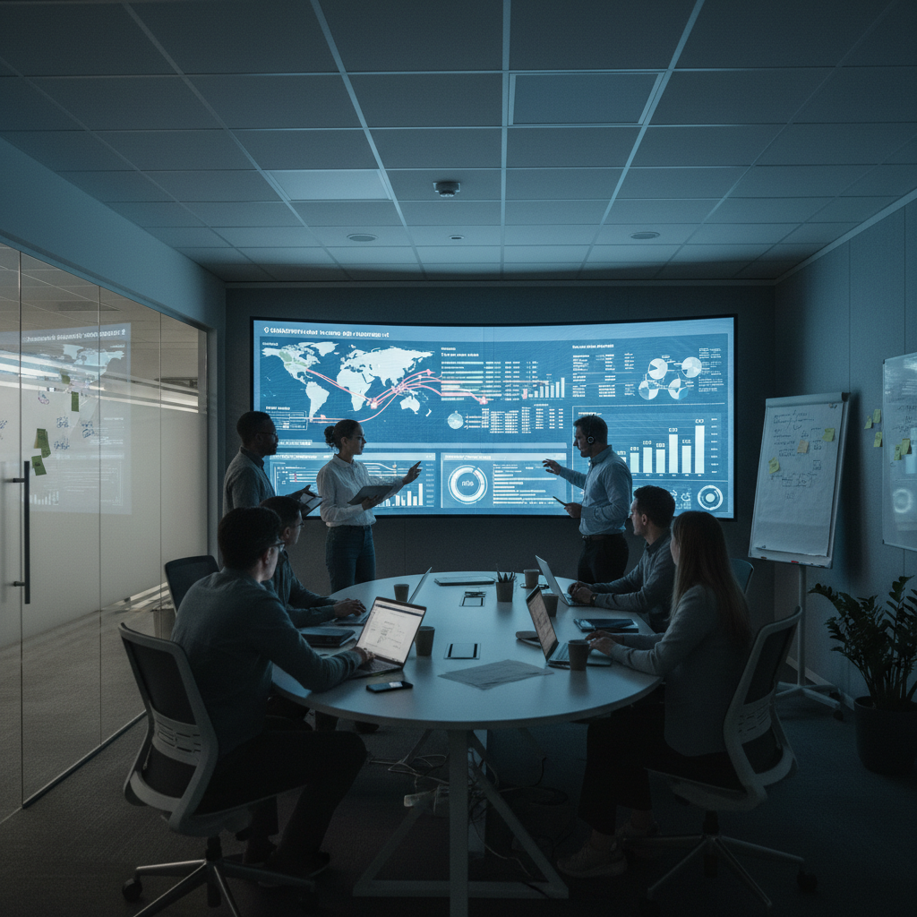 Zespół specjalistów podczas analizy danych z inteligentnego systemu zarządzania logistyką.