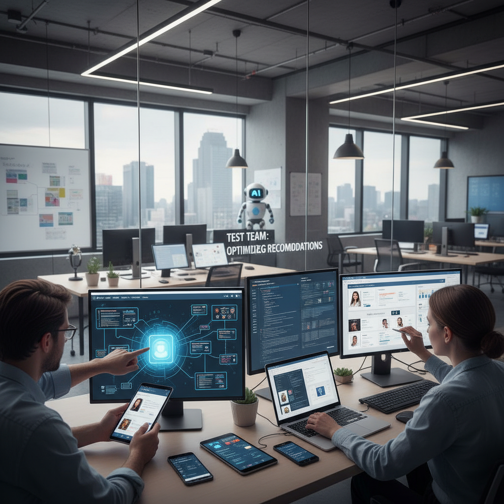 Zespół projektujący system rekomendacyjny – dynamika pracy i analiza danych są kluczowe.