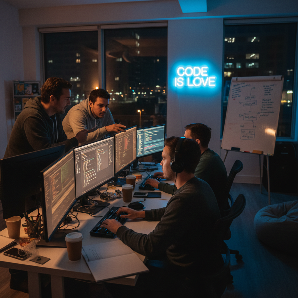 Alt: Mały zespół wdraża model AI w firmie, ekrany pełne kodu, nocny klimat